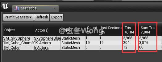Tris表示单个Mesh的三角面;SumTris表示该类型的Mesh面数总和。