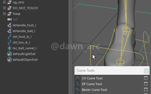 5, Create three blank curves as anchor: ctrl_foot_in_tilt_l, ctrl_foot_out_tilt_l and ctrl_foot_heel_pivot_l.